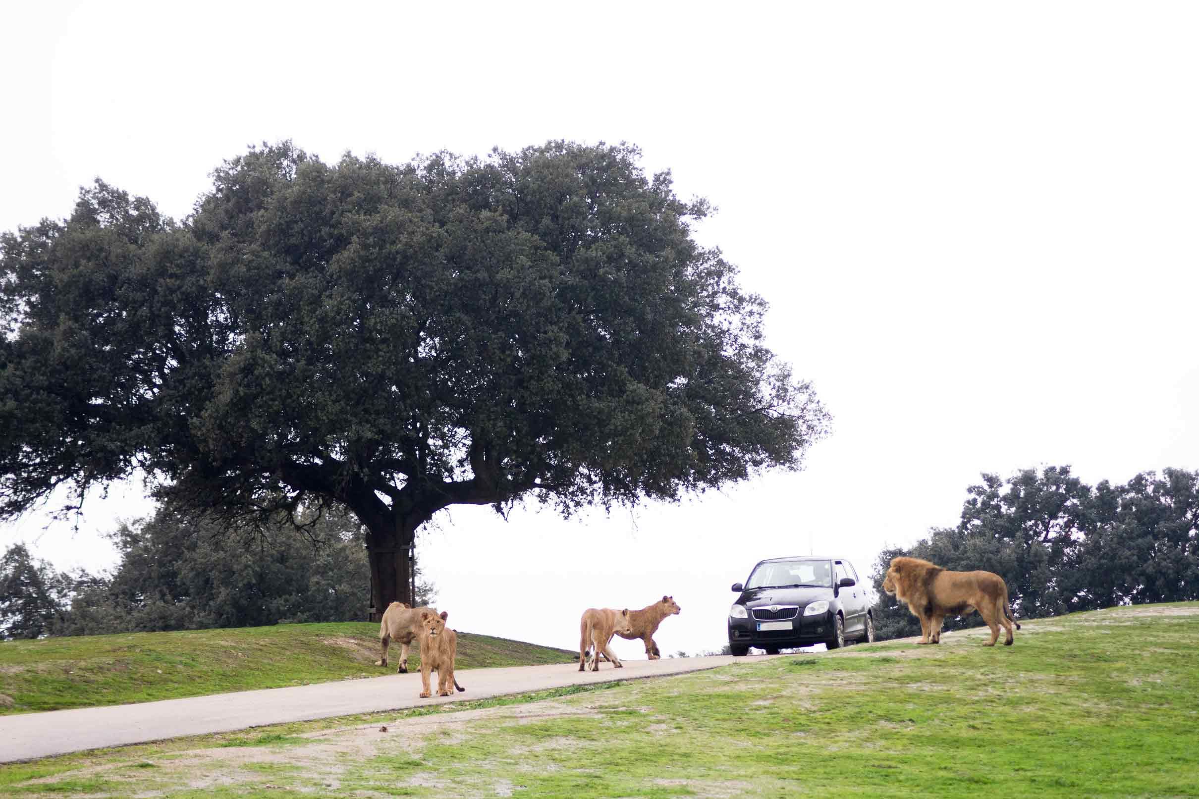 Leones: el único felino que vive en grupo, y en Safari Madrid podrás sentirte parte de la manada alrededor de todos ellos, ¡porque están en semilibertad! Recuerda que, en la carretera, tienen preferencia.